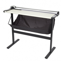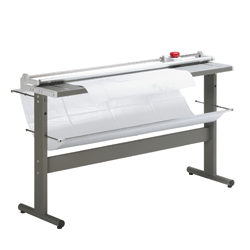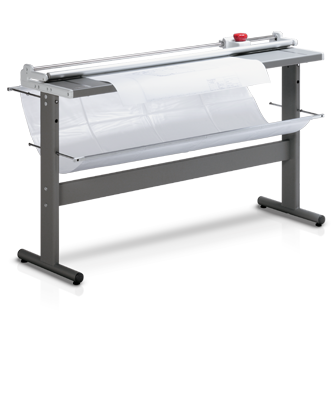 Tukeva rullaleikkuri jalustalla suurkuvien leikkaamiseen. Leikkuri on varustettu lovetuilla päätyvas...